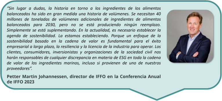 “Aunque 2023 tuvo sus desafíos con la geopolítica, las condiciones climáticas y la inflación, también vimos un movimiento significativo en el desarrollo estratégico clave dentro de la industria. La contribución valiosa y única de los ingredientes marinos es bien reconocida y cada vez se presta más atención a su aplicación estratégica, con nutrición de precisión y un aumento de la producción a través de subproductos. IFFO ayudó a impulsar estas discusiones en nuestros eventos y otras discusiones de la industria mediante la publicación de nuestros últimos datos sobre los subproductos, y continúa comunicando cómo se utilizan estratégicamente los ingredientes marinos. Nuestra industria también está progresando más allá de los materiales de origen responsable y ahora comprende la evaluación más amplia del ciclo de vida (life cycle assessment, LCA) de los ingredientes marinos. IFFO continúa contribuyendo con Data-In-Project del Instituto de evaluación del ciclo de vida (LCA) de alimentos balanceados mundiales (Global Feed Lifecycle Institute, GFLI) para aumentar nuestros conocimientos en esta área crítica, y este es un gran ejemplo de nuestro rol único en la representación y el progreso de nuestra industria”.