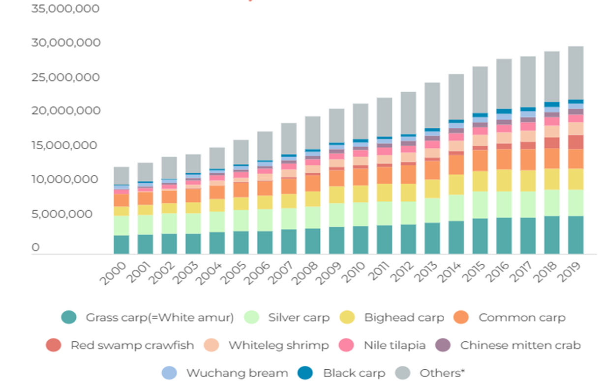 Figure 1. China aquacutlure production by year and species (data from IFFO 2022).